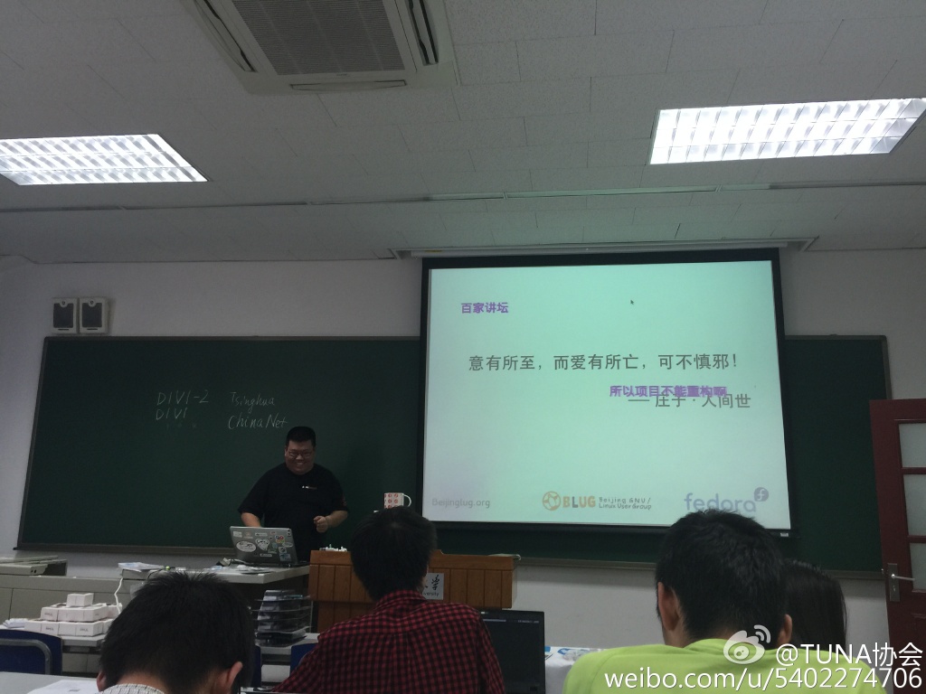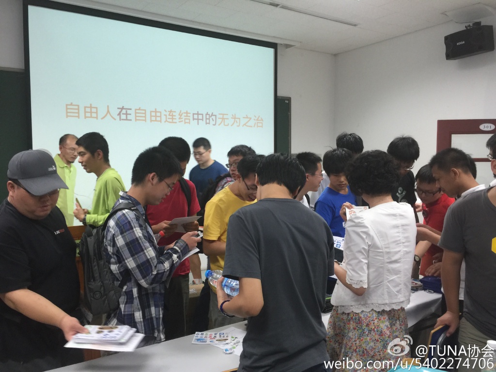 Tonghuix 演讲过程中,现场的投影设备出现故障,在电教老师积极帮助下,我们在中场休息时间更换了一个更大的教室。同时,自由抢礼品环节到,热情的 参与者基本人手一套来自各个赞助方、以及 TUNA 自制的纪念品,现场气氛火爆。