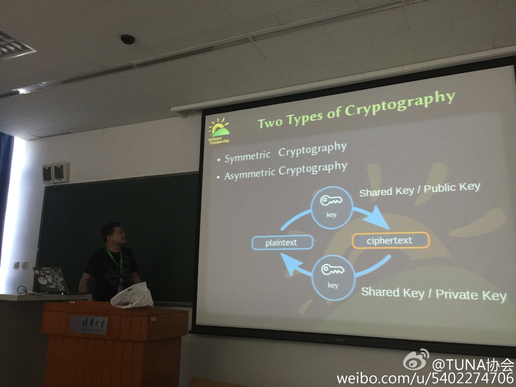 休息结束,高中生黑客 @比尔盖子V 带来了互联网加密科普演讲。演讲包含了密码学作用、类型及使用的原因,算法的安全性问题,密码学所不能完成的工作等内容。 讨论了 SSL/TLS 的问题、GnuPG 的诞生与使用。介绍了用于公钥确认的信任模型:PKI、TOFU 及 PGP。顺带附加讨论了可靠的 RNG 与熵的问题,并推荐大家使用 HTTPS Everywhere 扩展积极使用 HTTPS。 slide