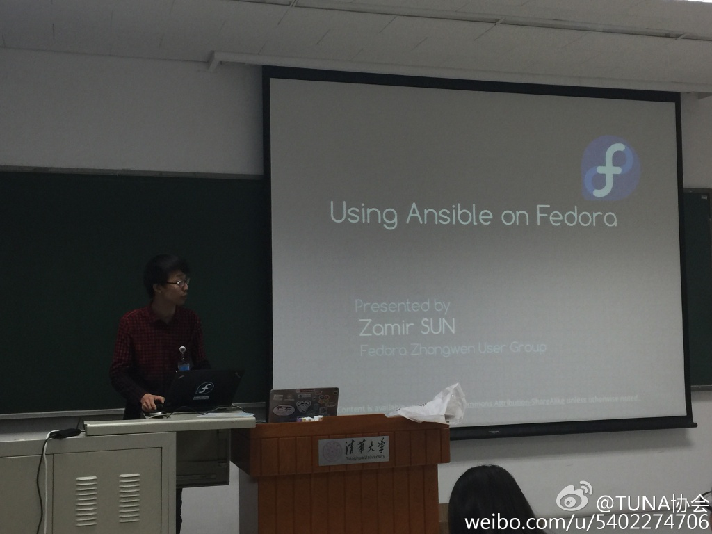 最后时间紧张,来自 Fedora 的 Zamir SUN 以闪电演讲的风格展示了在 Fedora 上使用 Ansible。演讲中介绍了 Ansible 的优点:纯 SSH 、并行、 无 agent 及使用可读的 YAML。并现场演示了 Ansible 的安装、hosts 配置、ping、命令执行及利用 YAML 文件配置进行 NTP 时间更新。 最后鼓励大家参与到 Fedora 社区中来。slide